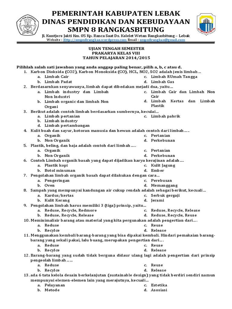 P i lihlah li hlah salah salah satu satu jawa jawaban yang yang benar benar!! Pilihlah jawaban yang paling tepat diantara huruf a, b, c atau d, dengan cara menghitamkan lingkaran pada lembar jawab yang tersedia! Terdapat 30 butir soal yang mencakup materi parakarya kelas 8 smp/ mts semester 1 dengan komposisi soal per bab sebanyak 6 soal. Download soal pts smp kurikulum 2013. Bab 2 teknologi informasi dan komunikasi. File soal tersedia dalam program ms word sehingga 4. Tehnik penjernih air by titin_1234. Soal pts (uts) kelas 8 smp / mts semester 1 (ganjil) kurikulum 2013. Contoh soal pts prakarya smp/mts kelas viii tahun 2018. Soal pts prakarya kelas ix semester genap tahun pelajaran 2019/2020. Latihan soal uts pts prakarya kelas 8 semester 2 kurikulum. Soal latihan uas kelas 8 smpmts semester 1 ganjil sahabat setia buku paket kegiatan belajar mengajar pada pertengahan tahun pelajaran 20162017 akan segera berakhir. Materi mapel prakarya kelas 8 semester satu ini mencakup :