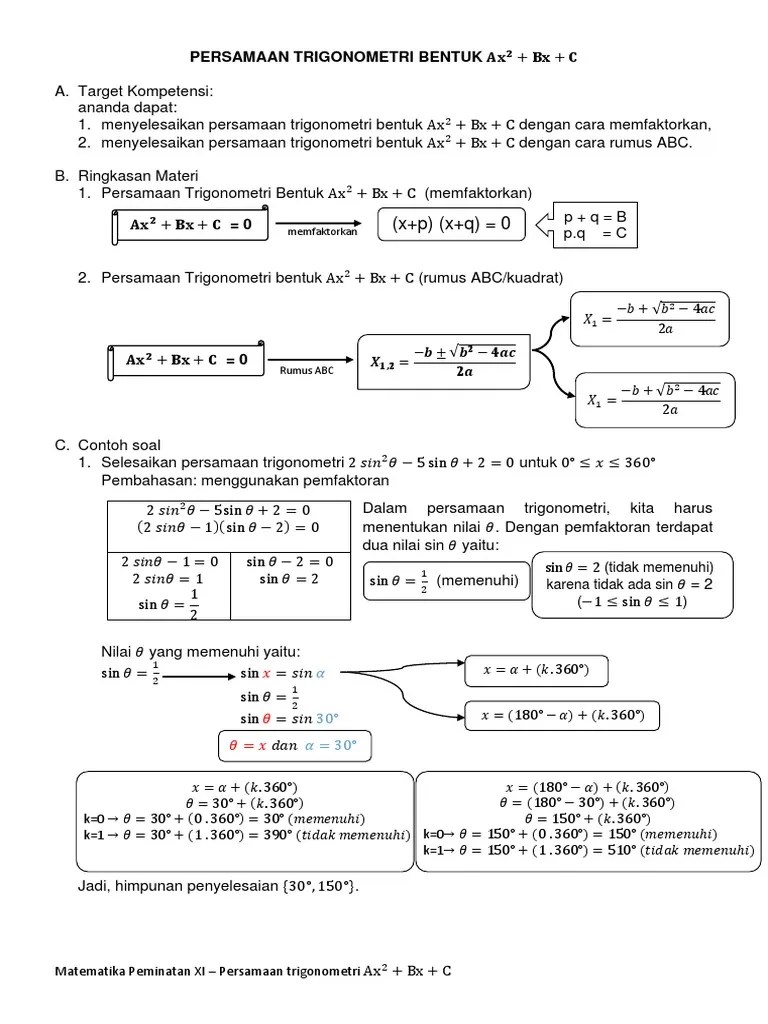 Setelah memahami modul ini diharapkan dapat menentukan penyelesaian persamaan trigonometri baik persamaan dasar maupun persamaan kuadrat. Rpp fungsi dan persamaan trigonometri kelas xi permen 22 1. 50+ contoh soal trigonometri kelas 11 dan pembahasannya pdf . { 𝜋, 𝜋} 6 6 5 11 d. Untuk 0° ≤ x ≤ 360° tentukan himpunan penyelesaian dari sin x = ½ ….